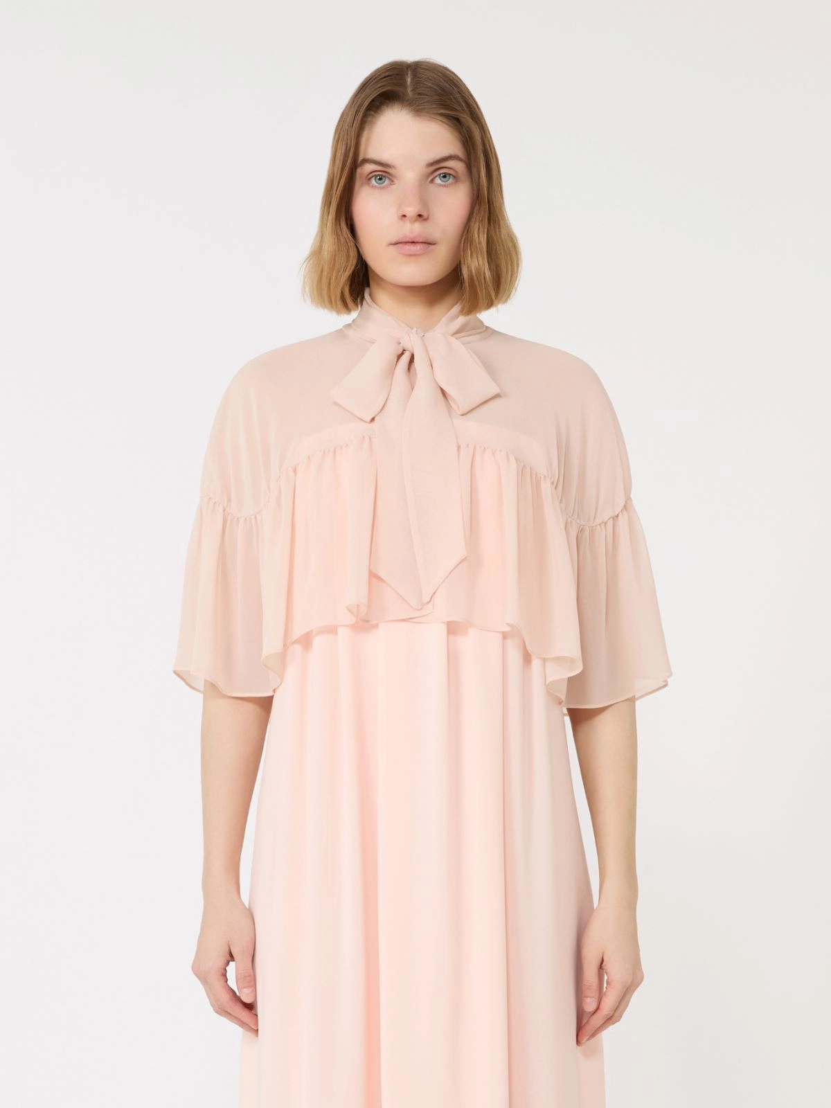 Short cape with sashes at the neck to tie in a bow and a flounce at the hem.