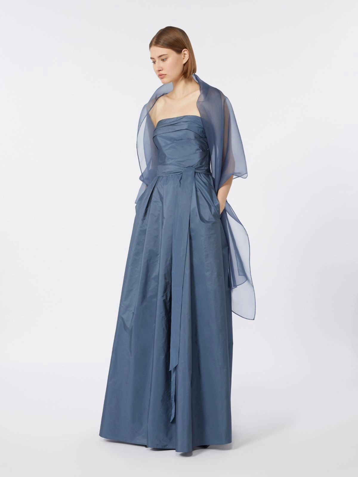 Long dress with a couture-inspired draped bustier, waist seam and a nuanced pleat motif on the skirt.